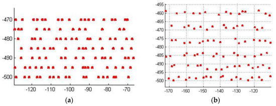 Figure 13. Points distribution on the (u, v) domain when sampling along u-section line: (a) the case when u-fluctuation is equal to zero; (b) the case when u-fluctuation ranges from −1.5 to 1.5 randomly. In this picture, v direction is the horizontal direction, and u direction is the vertical direction. - additional error introduced by resampling: If the average distance between measured data and the final fitting surface is denoted as called the average fitting error, and that between resampled data and is denoted as then the absolute difference is the additional error introduced by resampling.