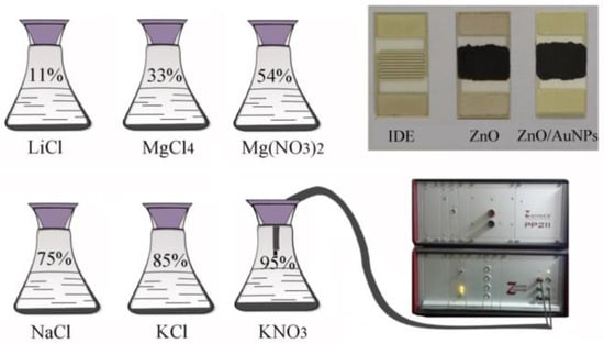 To study the relative humidity response of the as-synthesized ZnO/AuNPs nanocomposites, the synthesized sample was mixed with DI water in a weight ratio of 5:1 to form a paste that was coated on the top of a five pair Ag-Pd interdigital electrodes (IDE) ceramic substrate (40 mm × 70 mm) to form a sensitive film. Then the film was dried in vacuum for 10 min at 60 °C and aged for 48 h at RT before RH experiments. The experimental humidity measurements and the photographs of actual humidity sensors based on both ZnO and ZnO/AuNPs are shown in Figure 1. In humidity sensing experiments, a controlled humidity environment was achieved by using supersaturated aqueous solutions of LiCl, MgCl4, Mg(NO3)2, NaCl, KCl and KNO3 which generate 11%, 33%, 54%, 75%, 85% and 95% RH at room temperature (25 °C), respectively. Two conducting wires with a portion firmly sealed in the rubber seal were connected between the sensing device and an external power supply. The response of the ZnO/AuNPs humidity sensors according to the change in RH was measured by the Zennium workstation at room temperature. The voltage was set to be AC 1 V and the frequency was changed from 40 Hz to 100 kHz in humidity studies. For the sensing response transient measurement, the sensing device was kept in the flask with 11 RH% at first. After the sensing response reached a steady state, the sensing device was then switched to another flask with different RH%. While exchanging the sensing device among flasks, the average switching time was shorted within 2 s to minimize possible interference with the response transients. Comparing ZnO with the ZnO/AuNPs nanocomposites, it is noticed that ZnO/AuNPs nanocomposites become darker and more metallic after being milled, which is attributed from the decreasing of the nanocrystals in diameter and the changes of the refractive index of the samples.