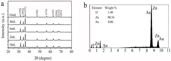 XRD analysis was used to investigate phase structure and crystalline size of ZnO/AuNPs with different amount of AuNPs. In Figure 2a, all the diffraction peaks present a good match with typical hexagonal wurtzite structure of ZnO (JCPDS card No. 80-0075), and these XRD data suggest that the obtained ZnO nanocomposites be of well crystallized hexagonal wurtzite type. We can observe that the intensity of the XRD peaks of pure ZnO is relatively high. For AuNPs hybrid ZnO nanocomposites with different amount of AuNPs, the XRD spectra show similar peaks related to that of pure ZnO and there is no additional XRD peak of AuNPs can be observed due to small amount of AuNPs. The intensities of (100), (002) and (101) diffraction peaks decrease with the increase of AuNPs amount. This result indicates that the crystallity of ZnO decreases when the amount of AuNPs is increased. Furthermore, no shifts in position of diffraction peaks are observed, indicating the formation of ZnO/AuNPs nanocomposites rather than the substitution of Au into ZnO crystal lattice or Au interstitial atom [21]. The chemical composition of ZnO/AuNPs nanocomposites is identified by energy dispersive X-ray (EDS) spectrum and the respective elemental concentrations are shown in Figure 2b. It reveals that the atomic percentage of Au is about 0.06%, the percentage of Zn is about 98.54% and the percentage of O is about 1.4%.