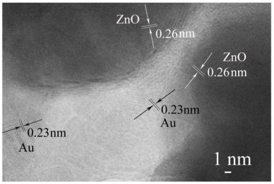 Figure 3 shows the TEM images of ZnO/AuNPs nanorods (Sample 3). A magnified crystal structure is displayed in Figure 3 in which the lattice fringe of 0.26 nm can be indexed to the (002) plane of wurtzite structure of ZnO and the lattice fringe of 0.23 nm can be indexed to the (111) plane of face-centered-cubic Au [22]. The actual chemical composition of each sample determined by XRD is consistent with the EDS results and is found to be quite close to the target composition, which indicates the formation of AuNPs hybrid ZnO proceeds very well.