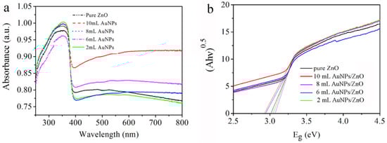 (a) Absorbance spectra and (b) Plot to determine the band gap energy of the AuNPs hybrid ZnO with different amount of AuNPs.