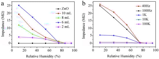 (a) Humidity sensing curves showing the decrease in impedance with the increase of the relative humidity for ZnO and ZnO/AuNPs with different amounts of AuNPs; (b) Relationship of impedance and relative humidity based on ZnO/AuNPs nanorods (Sample 3) at various frequencies.