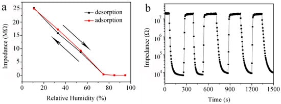 How to minimize the hysteresis effect is crucial for a humidity sensor. If the sensing curves for the adsorption and desorption processes cover each another well, a humidity sensor will display a good reversible performance. Figure 7a shows the humidity hysteresis properties of ZnO/AuNPs humidity sensor in the processes of both adsorption and desorption in the range from 11% to 95% RH. A narrow humidity hysteresis loop shows good reversible sensing properties.
