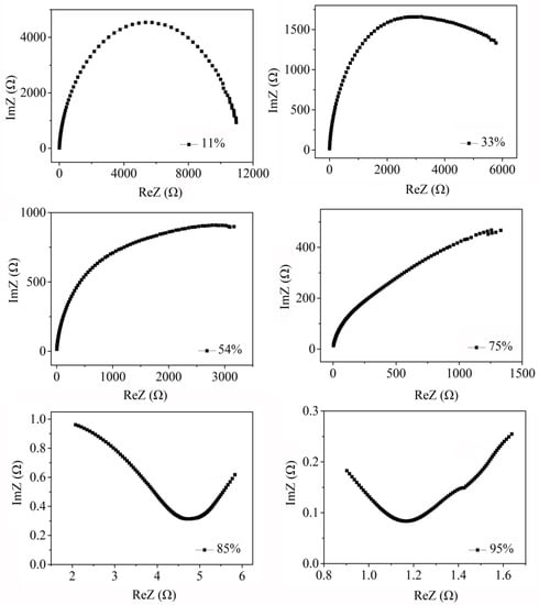To understand the humidity sensing mechanism, the complex impedance properties of ZnO/AuNPs were measured at different RH% and they are presented in Figure 8. A small portion of semicircle to intrinsic impedance is observed at low RH% (11% and 33%), which is diminished as RH increases. At low RH%, H-bonding causes the water molecules to be chemisorbed on the surface of ZnO between oxygen atom of water molecule and hydroxyl layer. The conduction is caused by H3O+ in the region of low RH% [2,14]. Starting from 54% RH to 75% RH, there is an evident straight line in the low frequency region. As the RH increases, more water molecules are adsorbed on the surface and tend to form a liquid-like layer. Under this process, the proton conductivity plays the leading role, resulting in the discontinuity of the adsorbed water molecules [2,25]. When RH is increased to high RH (85% and 95%), the proton conductivity is changed into the ion transfer, and the free ion and water molecules are penetrated into the ZnO/AuNPs sensing film, which leads to the rapid decrease of impedance and the large increase of the capacitance for the sensors [25].