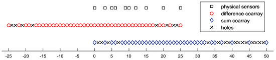 To give an intuitive impression of these configurations of the coprime array, we give an example by assuming a coprime array with physical sensor positions at . The difference coarray and sum coarray are shown in Figure 1 with red circles and blue diamonds, respectively. Holes within the coarrays are marked with crosses.