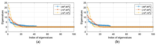 The dispersion of the eigenvalues for distinctive source intervals. (a) The eigenvalues of the correlation subspace matrix; (b) the eigenvalues of the conjugate correlation subspaces.