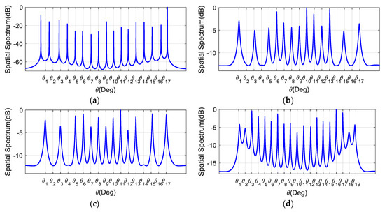 Spatial spectrum of the proposed algorithms and the SS-MUSIC algorithm. Subfigures (a–c) depict the performance in the first scenario with 13 signals of interest (SOIs) and 4 interference sources; subfigure (d) depicts the performance in the second scenario with 19 SOIs. (a) SS-MUSIC; (b) CI-DC; (c) CI-SC; (d) CI-DC.