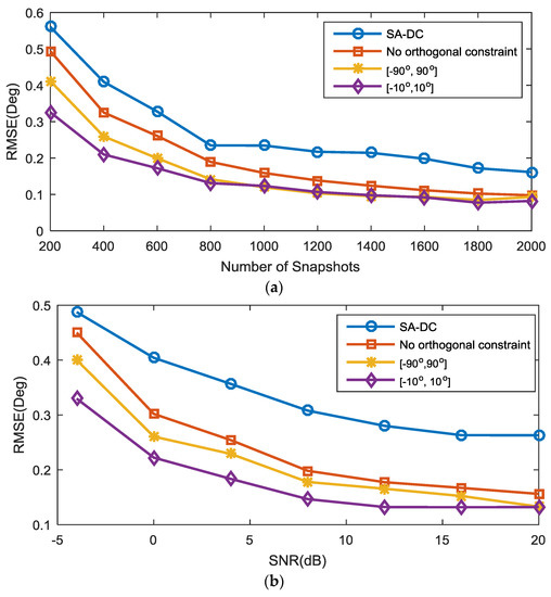 Root mean squared error (RMSE) performance comparison with the difference coarray model. (a) RMSE versus the number of snapshots with SNR = 0 dB; (b) RMSE versus SNR with 400 available snapshots.