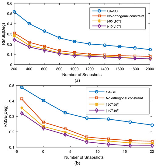 In the second experiment, we compared the RMSE versus the number of snapshots and SNR with the difference coarray model between our CI-DC algorithm (including two different source interval conditions and without the orthogonal constraint condition) and the SA-DC algorithm. Both algorithms utilize the CCM as the second-order statistics and have interference elimination capability. The prespecified grids for SA-DC are from with a sampling interval of . The regularization parameter for SA-DC was empirically chosen to be 0.4, and the penalty parameter in our algorithm was set to 24 when the number of snapshots is less than 1000 in Figure 4a or the SNR is less than 12 dB in Figure 4b; otherwise, was set to 26. Five equal-power BPSK SOIs uniformly distributed between and impinged on the array. In Figure 4a, the SNR is fixed at 0 dB, and the number of snapshots is fixed at 400 in Figure 4b. The other settings were the same as those in the first experiment. As can be seen from Figure 4a,b, even though the SA-DC algorithm can utilize the whole difference coarray information, its performance is inferior to the proposed algorithm due to the basis mismatch caused by the prespecified grids. The proposed CI-DC algorithm with source interval outperforms the condition with source interval and the case without the orthogonal constraint, especially when the SNR is low and the snapshots are limited; this indicates that a smaller source interval helps to improve the performance remarkably. When the number of snapshots is larger than 1000 in Figure 4a and the SNR is larger than 16 dB in Figure 4b, the RMSE of the proposed algorithm with different constraint conditions is similar.