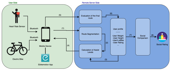 Overall architecture of the system: (1) the route selected by the user; (2) segmented route; (3) user profile data; (4) calculated assist levels; (5) data collected over the course of the route; (6) score obtained on the route; (7) comparison of the scores of other users; and (8) final social rating.