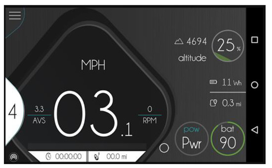 The ebikemotion project has been co-developed by the University of Salamanca and the company StageMotion [58]. The ebikemotion application for mobile devices [59] is central to the system developed in this article. This application, is compatible with more than 20 electric bicycle brands on the market and it has more than 5000 users from all over the world. This application visualizes all the values of the electric bicycle in real-time (battery level, assist level, velocity, altitude etc.) as can be seen in Figure 4. This application is free and is available in the two main mobile operating systems, Android and iOS. The application was launched in the middle of 2016 and it is possible to use it with electric bicycles as well as with traditional bicycles for recording routes via GPS.