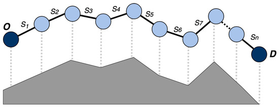 The second criterion for making this division is based on the difference of slopes at the different points of the route. Slopes are obtained for each of the GPS points p, therefore it is possible to group the adjacent route points which have similar magnitude of slope , in the same segment . The segments obtained can have different lengths . Thus, a route with origin and destination D is divided into a series of segments , which are connected one to another, as shown in Figure 5.
