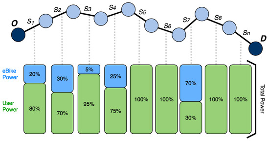 Power apportioned to each of the segments of the analyzed route. The power provided by the user (in blue) and the power provided by the electric engine (in green).