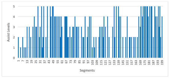 To illustrate how the route analysis system described in the work functions, a detailed analysis of one of the routes cycled by one of the users was carried out. It is a 14.5 km route in the city of Corseaux (Switzerland) whose altitude profile is shown in Figure 7. The route was made with a 750 W electric bike with a configuration of six levels of assist, as shown in Figure 2. First, the route was processed using the previously described algorithm to divide it into segments. After this analysis, the system determined that the route was composed of a total of 200 segments. Next, the system calculated the power that the user must provide and the power that the engine must supply to perform the exercise. As detailed in Section 3.3, in this calculation, it is necessary to consider the slope of each segment and the user’s ability level in the system. In this case, the user had ability level 4, so the system determined their average speed to be 19 km/h over the course of the route. Based on these data, levels of assist are established for each of the segments. The resulting set of assist levels is shown in Figure 8. Finally, these assist levels are sent to the mobile application and the user begins the route.
