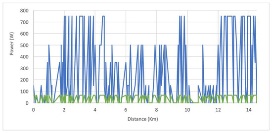 Once the route is completed, the data collected over the course of the route are sent to the central server for analysis. In Figure 9, we can see the actual power that was provided by the engine (in blue) and the power provided by the user (in green). First, Figure 8 shows how the amount of power is adjusted to the slopes of the route. A greater amount of power has been provided in the segment from 2 to 4 km, due to the inclination of that part of the route. The same happened in the segment from 9 to 10 km and in the final segment of the route, from 12 to 14.5 km. On the contrary, at the segment starting at 10 km and finishing at 12 km, the power provided is lower since the slope of this part of the route is descending. It is also possible to observe how the user’s speed is kept as constant as possible on the slopes, although if the selected speed is very high, the power of the engine does not allow the speed to be maintained. With this system, the user’s physical effort is not affected by the profile of the route. Regardless of the profile of the route, speed is kept as constant as possible; this helps prevent fatigue and makes exercise healthier. In addition, a heart rate monitor is employed as a safety measure which allows to increase the level of assistance automatically when the threshold of pulsations per minute is exceeded, as indicated in Section 3.1.2.