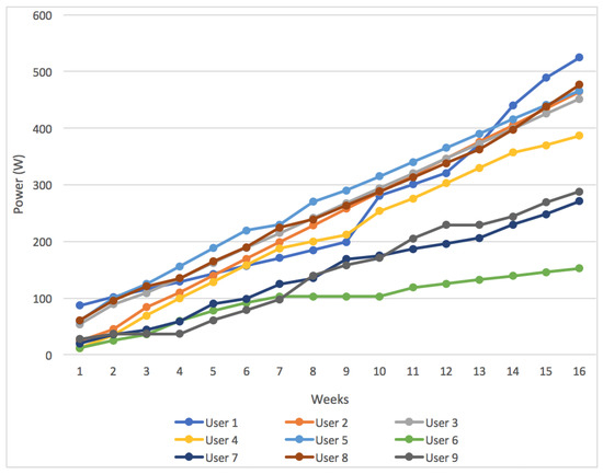 The results obtained at the end of the four-month case study are discussed below to show the progress of the participants. Figure 10 shows the results obtained by the participants and it illustrates the powers each of the users reached to, over the 16 weeks (four months).