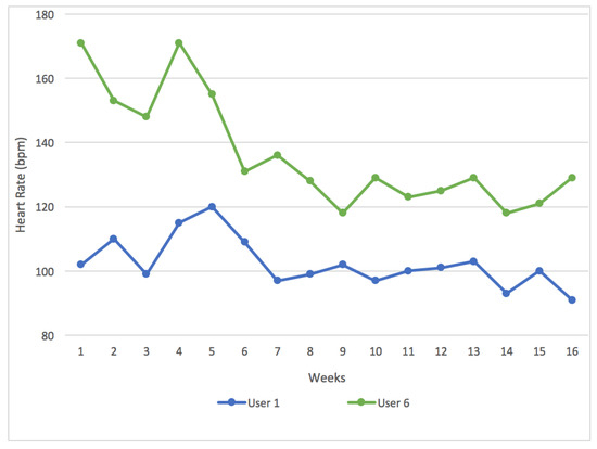After analyzing the data provided by the heart rate sensor, it was found that the progress of users who exercised regularly throughout the week was less evident than the progress of those who did little exercise. These data are influenced by factors such as the fitness of the user, the duration of the routes and their difficulty. Users who traveled longer routes with higher slopes, made a greater physical effort and therefore their average heart rate had been affected. However, we can look at the data of the two most representative users of the two groups, users who spent a considerable amount of hours exercising each week and those who did little exercise over the week. Figure 11 compares the mean evolution of the heart rate of these two users over the 16 weeks during which the study had been conducted. In the less active group, User 6 did an average of 1 h of exercise each week. In the first weeks, the user’s heart rate was high, however it gradually lowered over the next weeks. On the other hand, the progress of User 1 who did 13 h of physical activity weekly, is not as pronounced. This is because active users’ heart rate value tends to stabilize once they have reached a stable level of fitness.