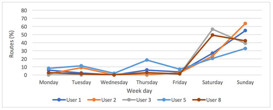 If we look closely at the percentage of routes performed according to the days of the week, we can clearly see that there are two groups. On the one hand, users whose cycling activity is high and constant on the weekends. In Figure 12, it can be read that users in this first group did their activities between 30% and 65% on Saturday and Sunday. While the activities carried out between Monday and Friday do not exceed 15% on average. This kind of users (Users 1, 2, 3, 5 and 8) have improved their average speed significantly over the 16 weeks.