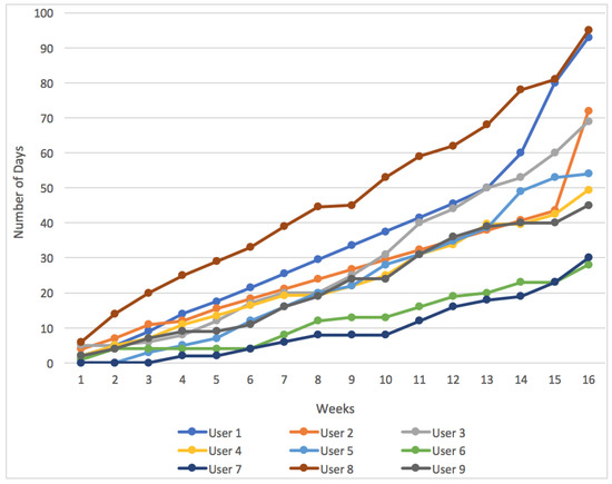 Figure 13 shows the data of the rest of users, the second user group. These users perform a greater amount of activities over the week than during weekends. In this case, on average, 85% of activities were done between Monday and Friday. This is because the users used their bicycles to commute daily in the city. Cyclists such as User 6 progressed in the number of hours they cycled over the week, from 1 h of exercise a week to an average of 5 h per week, thanks to the support offered by the electrical assistance system.