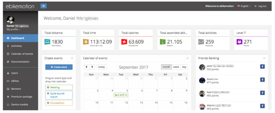 Finally, Figure 15 shows a screenshot of the ebikemotion web application, where the results of the system can be visualized. On the bottom right-hand side, the rankings of friends who are also users can be viewed. In addition, it is possible to visualize other parameters such as the routes cycled, the calories burned or the scores obtained and the user’s ability level.