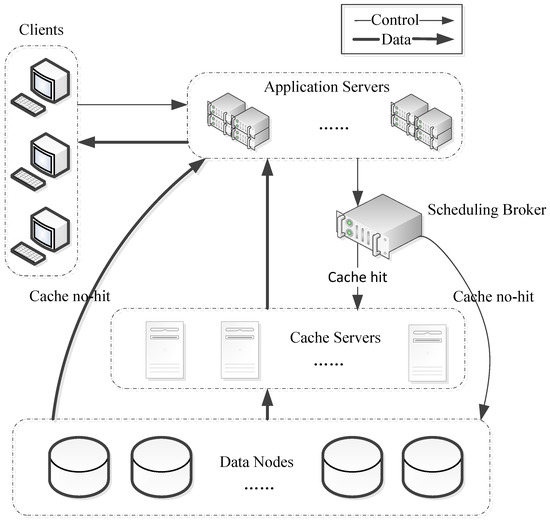 Figure 1 shows a typical distributed caching-based application service system architecture of a smart city, which consists of five parts: clients, application servers, scheduling broker, cache servers, and data storage nodes.