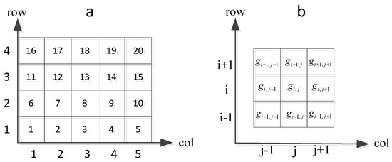 Figure 2a shows the geographic rectangular area, which is divided into 4 × 5 cells and the meshing cell coding. Figure 2b shows all the neighbor cells of cell gij.