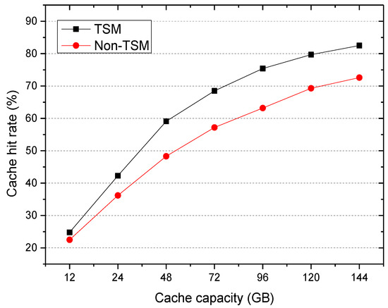 As can be observed, as the cache capacity increased, the cache hit rate of the system gradually increased until it was stable. In addition, the TSM cache hit rate was higher than that of the Non-TSM, and this became more obvious as the cache capacity increased. This is because the Non-TSM mechanism directly calculates the number of accesses to the file, and the attenuation of file access over time is ignored.
