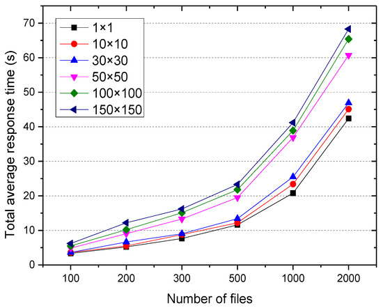 As can be observed, for the same regional meshing level, the total average response time increased as the number of file increased. However, for the same number of files, as the meshing level increased, the total average response time also increased, and the minimum was achieved when the meshing level was 1 × 1. This is because the increased density of the mesh, the lower probability of the user access files belonging to the adjacent geographic region and the same time period, and the less access associated files found cannot reduce the request cross node scheduling times.