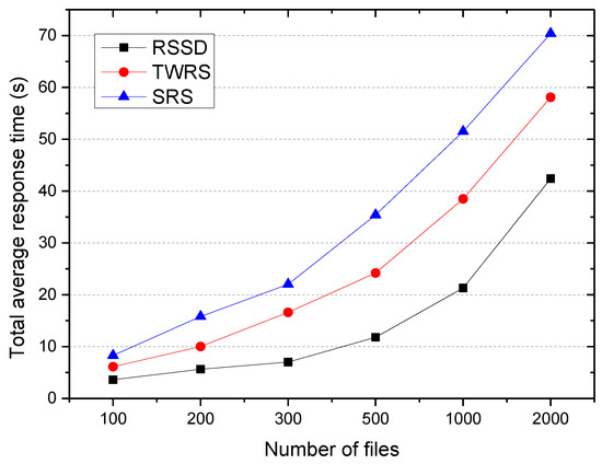 In terms of the experimental comparison of the RSSD algorithm, the time-weighted replication strategy TWRS in [10,11] considered the decay time but did not consider access correlation, and the simple replication strategy SRS in [8,9,14] did not consider access correlation and decay time, but considered the access frequency, node load, real-time bandwidth, etc. The experiment investigated the total average response time of the system when the user accesses the 500–3000 files, and the result is shown in Figure 6.