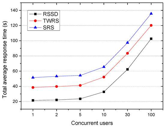 It can be seen that as the number of concurrent access users increased, the average response time also increased; however, the total average response time of RSSD was still the smallest. This is because the RSSD not only creates replica, but also places the associated files as a whole in the same cache node and realizes bidirectional optimization of the request queuing and cross node scheduling times. In addition, it can also be seen from the graph that when the number of concurrent access users was 1–5, the total average response time of RSSD, TWRS, and SRS algorithms were almost unchanged and appeared to be stable, then increased rapidly. This is because the distributed cache node was set to be 6, and the number of replica of the cache file did not exceed the number of nodes; therefore, when the number of concurrency access of the same file was greater than 6, there was requests queuing, which increased the total average response time.