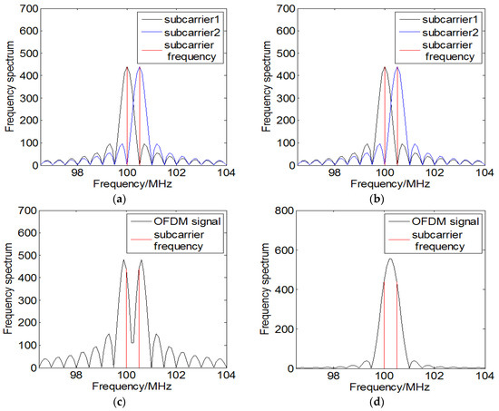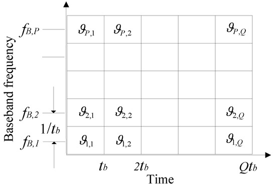 For , , where is the subcarrier’s phase within the duration of the elementary symbol, is the duration of the completed OFDM elementary symbol, is the baseband frequency of the subcarrier, and is the frequency spacing of the adjacent subcarriers which is equal to the reciprocal of .