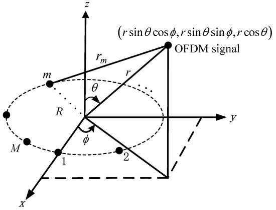 Consider a UCA in the -plane with radius and identical omnidirectional sensors impinged by an OFDM signal. The sensors are uniformly and counterclockwise spaced on the circumference where the first sensor is located at the x-axis, its geometry is shown in Figure 2. The near-field OFDM signal is located at , where the azimuth angle is measured counterclockwise from the x-axis, the elevation angle is measured downward from the z-axis, and the range is measured from the center of the UCA. The output of the sensor of the UCA at the sample is given by