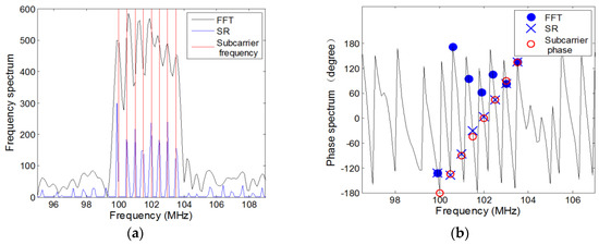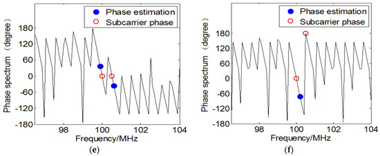 For the received data of the sensors under UCA, considering that the OFDM source is a form of mono-frequency source that needs to consider the impact of frequency, the conventional method employs the FFT algorithm to obtain the frequency spectrum and estimate the frequencies of subcarriers. Although padding zeroes at the tail of the discrete measurements is equal to interpolating in the frequency domain, which can improve frequency resolution and avoid the phenomenon of spectrum leakage, it will lead to the inaccuracy estimation of frequency as well as the corresponding phase. Take the first sensor’s received data for example, considering that an OFDM signal contains two subcarriers whose phase-code is same and frequency interval is 0.5 MHz, the subcarriers’ frequency spectrum by performing the FFT algorithm under noiseless condition is shown in Figure 3a, where the black curve and the blue curve represent the frequency spectrum of the two subcarriers respectively. It can be noticed that the subcarrier’s spectrum has half overlap with each other, which reflects the orthogonality of the OFDM signal’s subcarriers. The frequency spectrum of the OFDM signal is shown in Figure 3c, where the red lines represent the real frequencies of subcarriers. Because of the disturbance of the main and side lobes to the other subcarrier’s spectrum, the peaks of the frequency spectrum is deviated from the actual values. The phase spectrum is shown in Figure 3e, where the red hollow dots represent the real phases of subcarriers and the blue solid dots represent the corresponding phases of the frequency spectrums’ peaks. It can be seen that the phase-code of the subcarriers is equal but the estimated phases is deviated from the true values. Besides, when the difference of phase-code is and the frequency interval is 0.5 MHz, the frequency spectrum and phase spectrum are shown in Figure 3b,d,f. It can be noticed from Figure 3d that the subcarriers cannot be resolved from the peak in the frequency spectrum.