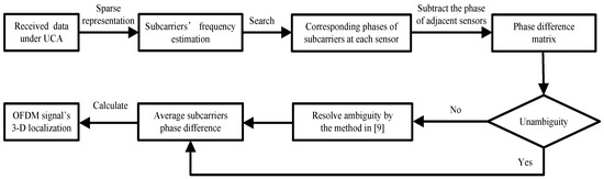 The flow chart of the proposed closed-form algorithm based on phase difference for a near-field OFDM signal’s 3-D localization is shown in Figure 4.