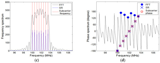 When the signal-to-noise ratio (SNR) is set at 0 dB and 20 dB, the frequency spectrum of the first sensor’s received data are respectively shown in Figure 5a,c, where the red lines represent the real frequency of subcarriers, the black curve represents the frequency spectrum by employing the FFT algorithm through padding zeros at the tail of the discrete received data, and the blue curve represents the frequency spectrum by performing sparse representation. It is noteworthy that the peaks by employing the FFT algorithm do not correspond to the actual values but the peaks of the sparse representation can estimate the subcarriers’ frequencies accurately. The phase spectrum are shown in Figure 5b,d, where the red hollow dots represent the real phases of subcarriers, the blue solid dots represent the corresponding phases of the peaks in the frequency spectrum by employing the FFT algorithm and the × shape dots represent the corresponding phases of the peaks by employing sparse representation. It is can be seen that the FFT algorithm loses efficacy for the frequency and the corresponding phase estimation but the results of the proposed sparse representation is corresponding to the actual values. The conclusion could be reached that the proposed method of sparse representation is superior in the performance for estimating the frequencies and the corresponding phases for the OFDM signal.