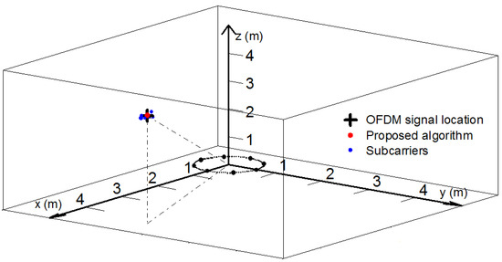 As shown in Figure 6, the + shape represents the OFDM signal real location, the red dot represents the location of the proposed method and the blue dots represent the locations of the individual subcarriers’ locations by employing the method in [8]. Due to the fact that the method in [8] is only suitable for the single-frequency source, it is can be noticed that the positioning results of the individual subcarriers are distributed around the OFDM signal’s real location, and the proposed algorithm with comprehensive utilization of the subcarriers’ phase differences and frequencies can achieve a more precise location.