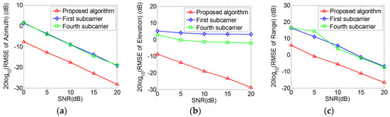 RMSEs versus SNR: (a) Azimuth angle; (b) Elevation angle; (c) Range.