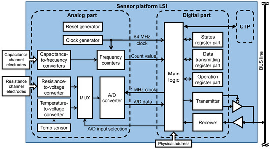 The sensor platform LSI was fabricated by a TSMC (Taiwan Semiconductor Manufacturing Co., Ltd., Hsinchu, Taiwan) μm standard CMOS process technology. As shown in Figure 3, the analog part includes a reset generator, a clock generator, capacitance-to-frequency converters, frequency counters, a resistance-to-voltage converter, an Analog-to-Digital Converter (ADC) and a diode-based temperature sensor. The on-chip clock is generated by a ring oscillator circuit, and its typical frequency is 64 MHz in design (about 61 MHz in measurement). The sensor platform LSI operates according to this internal clock.