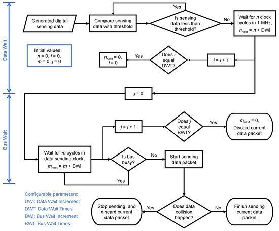 For relieving data congestion, the sensor platform LSI has a simple adaptation function to reduce the number of data packets sent by a specific LSI and avoid a specific LSI from being dominant in the serial bus line. As shown in Figure 5, this function includes two processes: “Data Wait” and “Bus Wait”. In the “Data Wait” process, when the digital sensing data exceeds the threshold value, a data sending start signal waits for a certain number of clock cycles (n) in 1 MHz. With the increase in the number of data packets (i) that enter this process, n increases linearly with an increment of “Data Wait Increment” that is configurable. When i reaches the set value of the configurable “Data Wait Times”, n and i are reset to 0.