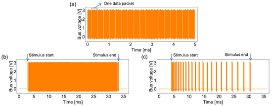 Figure 6 shows the signals of the bus on which one sensor platform LSI is operating with different configurations. When neither adaptation nor event-driven function is turned on (Figure 6a), the bus is busy with a small idle time ratio. By enabling event-driven (Figure 6b) and adaptation (Figure 6c) functions in order, the bus idle time ratio becomes larger. For the adaptation function configuration in Figure 6c, “Data Wait Increment”, “Data Wait Times”, “Bus Wait Increment” and “Bus Wait Times” were configured to 80, 64, 1 and 16, respectively. Note that Figure 6 shows the effects of the adaptation and event-driven functions when only one LSI operates to help illustrate these two functions. In the experiment, only the adaptation function was used.