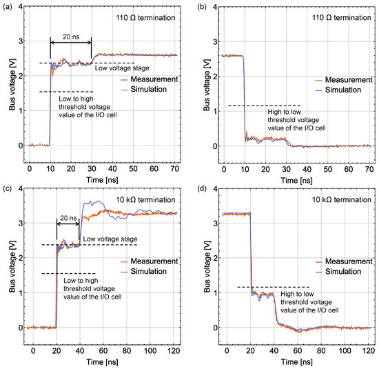 As shown in Figure 11a,b, there is no severe bus signal fluctuation under nearly matched termination (110 Ω), which makes it a better choice for high speed communication when a small number of LSIs operate simultaneously. When the bus line is terminated by 10 kΩ resistors (Figure 11c,d), the bus signal vibrates over or under the threshold value of the LSI’s I/O cell, which does not have a negative impact on the communication performance under 1 MHz data transmission speed.