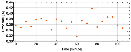 These results confirm that Carrier Sense Multiple Access in addition of Collision Avoidance (CSMA/CA) was working as designed. As shown in Figure 13, the error rates of received data packets are less than 0.42% in 23 timing slots, which shows the reliability of our network system. Note that the residual error rate of CRC-16 designed in this study is on the order of , and negligible compared to the error rate of received data packets [24].