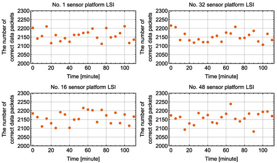 Figure 14 shows the number of received data packets in 30 along with elapsed time for four sensor platform LSIs. There is no obvious changing trend of the number of received data packets along with elapsed time, suggesting that the network system was stable.