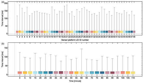 To evaluate the sampling frequency of the network system, we extracted the time interval between two data packets received by the FPGA-based relay node successively from the same sensor platform LSI within 30 . The time information was provided by the relay node, since the relay node attached a time stamp (in μs) to each received data packet. Figure 15a shows the time intervals of 48 sensor platform LSIs in 30 . Figure 15b illustrates the time intervals of No. 8 sensor platform LSI along with elapsed time in 23 timing slots. Among the time intervals of each sensor platform LSI extracted in each data receiving, the median is around 10 ms, and more than 75% of the time intervals are less than 21 ms.