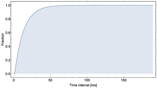 The empirical distribution function of these measured time interval values is illustrated in Figure 16. This function is a step function that jumps up by at each of the n value points (. Its value at a specified time interval value is the fraction of time interval values that are less than or equal to the specified value. As shown in Figure 16, 90.2% of the values are less than 30 ms. The fraction of values over 50 ms is less than 2%, and the fraction of values over 100 ms is less than 0.04%.