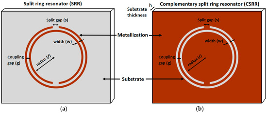 Metamaterial (unit cell) Topologies: (a) split ring resonator (SRR); and (b) complementary split ring resonator (CSRR).