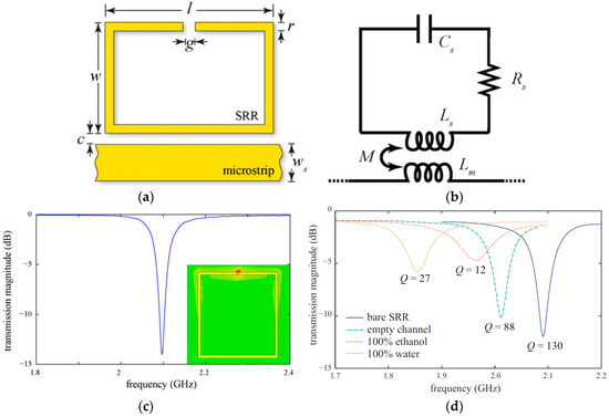 A microstrip coupled SRR on a RT/duroid 6010.2LM (Rogers Corporation, Connecticut, CT, USA) substrate (εr = 10.2, and a loss tangent of 0.0023) has been proposed as a chemical sensor, as shown in Figure 2 [33]. A polyethylene terephthalate (PET) film serving as microfluidic channel (made from craft-cutting), was positioned on the highest sensitive area of the ring resonator (the split-gap), to observe the maximum frequency shift. The complex permittivity of ethanol and methanol were characterized at 1.9 GHz, and the measurements were compared with the empirical values. The fabricated prototype sensor alone, and assembled in a complete sensing system is shown in Figure 2e,g.