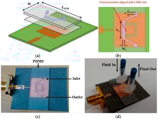 (a) Bird’s-eye view of the CSRR-loaded patch with an adhesive film and a microfluidic channel (top layer); (b) zoom-in view of channel alignment with CSRRs; (c) fabricated prototype of CSRR-loaded microfluidic patch as ethanol chemical sensor; and (d) side view with nanoport assembly (Redrawn from [4]).