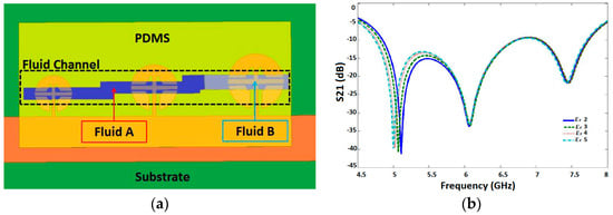 An open split ring resonator (OSRR) coupled with a microfluidic channel has been proposed as a chemical sensor [37]. It has been designed on RO3003 substrate (h = 1.52 mm, εr = 3, tanδ = 0.0013) to operate at 6.5 GHz. The PDMS based microfluidic channels having 100 µm depth were developed and sealed with 50 µm thick polyimide film on backside of PDMS before placing on the sensor surface. They demonstrated measurements using a single unit-cell, an aperiodic array of three unit-cells, and an array of three different frequencies. To characterize the proposed sensor, various concentrations of Isopropanol, methanol, and glucose-d have been tested to measure the resonant frequency, Q factor and the phase constant of propagation. A remarkable feature of the proposed sensor was an attempt to investigate simultaneous detection of multiple fluids taking advantage of periodic structure, as shown in Figure 4a. The permittivity of Fluid A was kept constant (εr = 1), and the permittivity of Fluid B was varied (εr = 2, 3, 4, 5). Because each unit cell contributes the sensor response independently, the insertion loss around 5 GHz is switched for different permittivity of Fluid B, as can be seen in Figure 4b. However, variation in sensor response with variation in permittivity of both Fluid A and Fluid B could not be discussed.