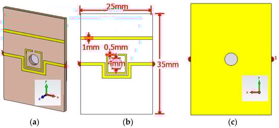 Metamaterial Based Microfluidic Sensor Design consists of a microstrip-coupled square shape ring resonator with one opening gap. A Microfluidic channel is positioned in the middle of the split ring resonator for a strong interaction of electric field with target analyte: (a) top view; (b) design dimensions; and (c) back view (redrawn from [38]).